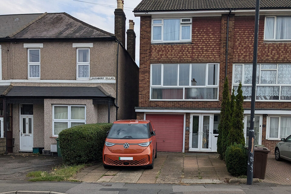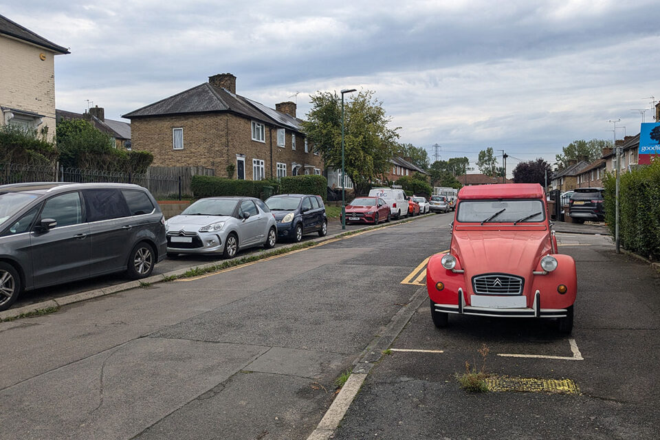 下は最近、散策した住宅地で、シトロエン 2CV(CITROEN 2CV)他、ポツポツと好き者のクルマが停められている地域でした。交差点の内側や前には、駐車を規制する黄色のラインが見えますね。事故を誘発しやすい場所にキッチリ規制をかけるところは自動車文化先進国、という感じがします。フォルクスワーゲン ID.Buzz(Volkswagen ID.Buzz)は、街中では初めて見ました。日本よりは多いものの、まだEVは少数派です。